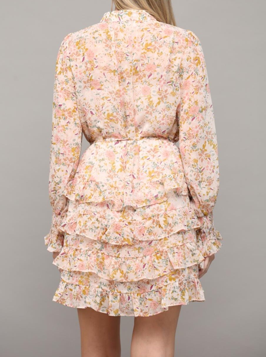 The Celine Mini Dress is a perfect piece to transition to Fall. Featuring ruffles and buttons down the front of the dress, a ruffle tiered skirt, smocked cuffs and a sweet tie at the waist. This dress comes with a slip to ensure full coverage.  Style with a tall suede boot.