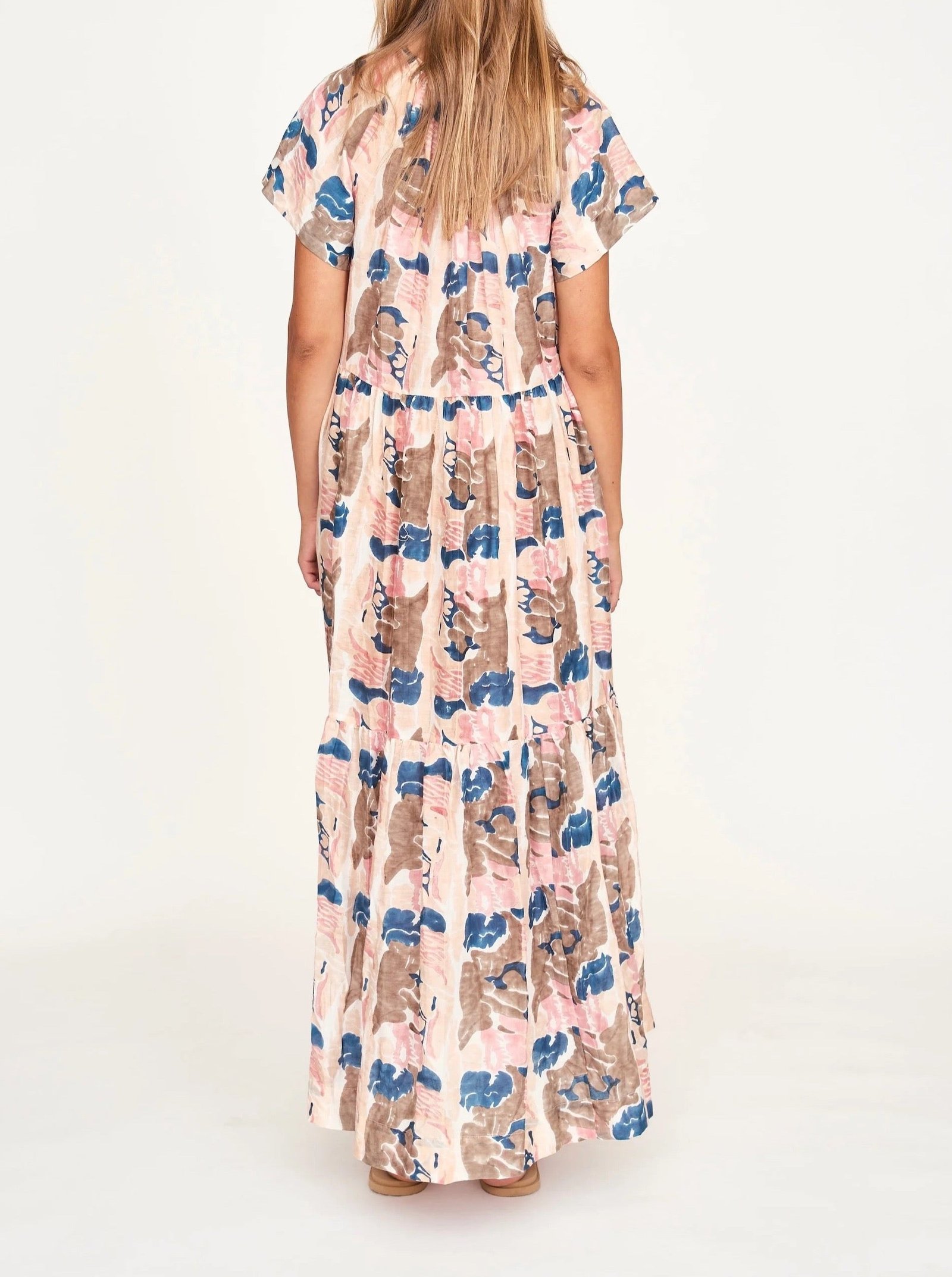- Tiered maxi dress with front button placket
