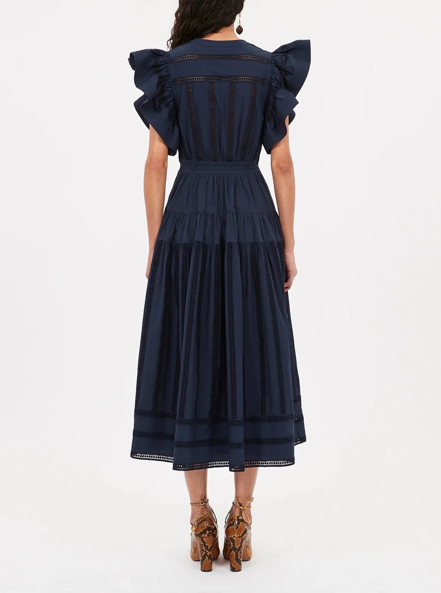 Awash in romantic detailing, the Emery Dress flutters with ruffles at the sleeves and has a waist belt that cinches the silhouette. This elegant midi frock is crafted from signature water-washed poplin that’s beautifully adorned with geometric eyelet stripes. Arriving in a delicate shade of navy blue, it has a notched neckline, side pockets, and fastens with a concealed side zipper.